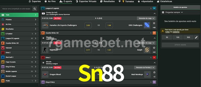 O Sn88 oferece uma grande seleção de opções de apostas em e-sports com probabilidades competitivas